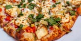 Garlic tandoori pizza. White sauce, pineapple, jalapenos, red onions, tomatoes, tandoori chicken, topped with fresh cilantro.
