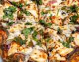 Butter chicken sauce, mushrooms, red onions, bell peppers, tomatoes, chicken and mozzarella cheese. Topped with fresh cilantro.